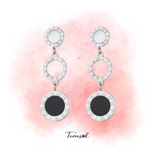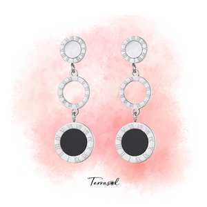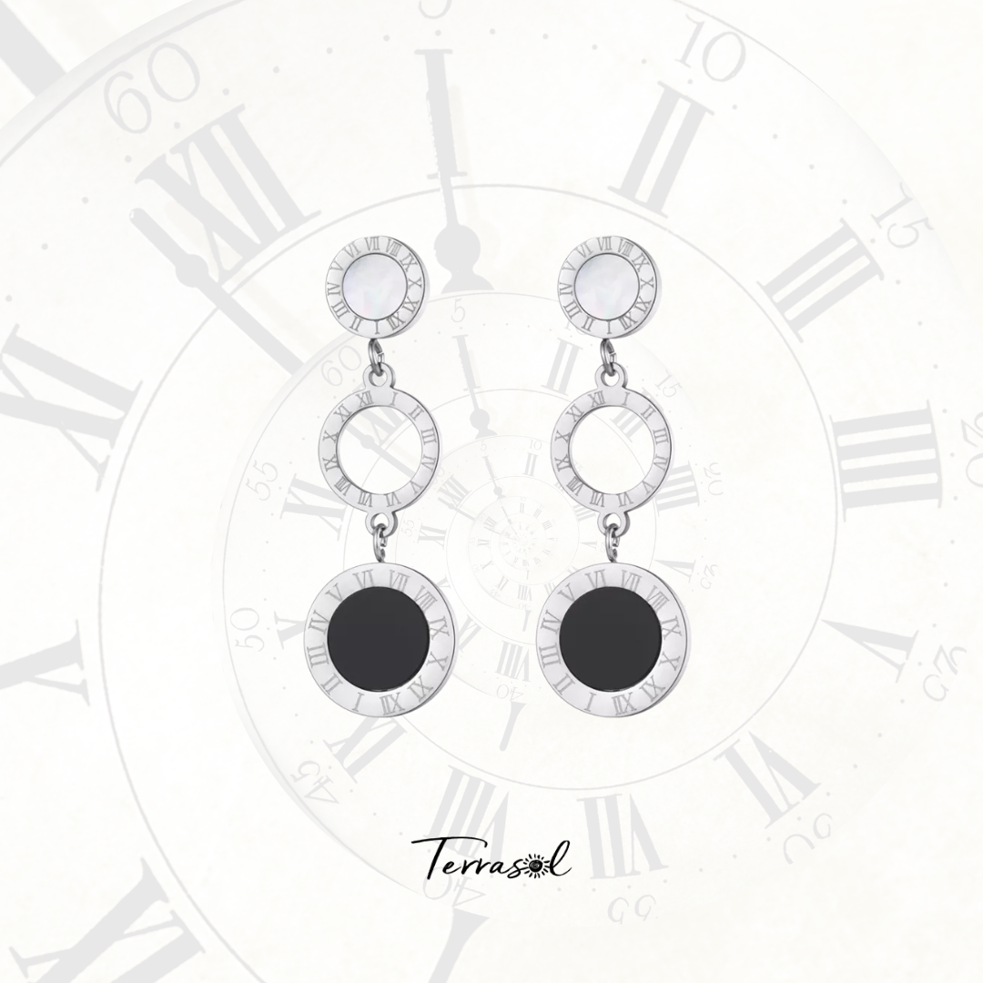 Pendientes largos adornado con piedraa dakar y números romanos, en acero inoxidable bañado en oro.